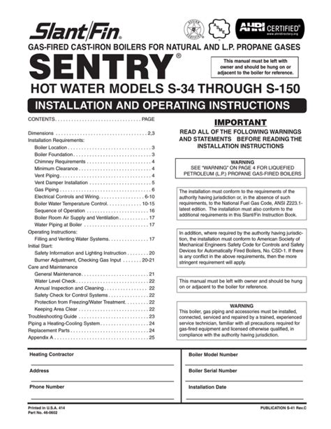 34 through s 150 installation and operating. V ent or breeching into chimney should not be inserted past. Propane gases sentry “s” and “sx” models hot water.